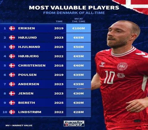 德轉(zhuǎn)統(tǒng)計丹麥球員歷史身價榜: