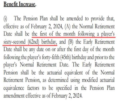NBA勞資協(xié)議條款里明確指出:正常退休日期應(yīng)為球員62歲生日后的第一個(gè)月的第一天;但同樣可以選擇從45歲生日次月的第一天到正常退休日期前的任意一天。早領(lǐng)早受益,但同時(shí)每月領(lǐng)取的金額會(huì)按規(guī)定系數(shù)削減,晚領(lǐng)晚受益,相應(yīng)的正常退休再領(lǐng),每月可以領(lǐng)取全額,聯(lián)盟自然是鼓勵(lì)球員從正常退休日期開(kāi)始領(lǐng)。