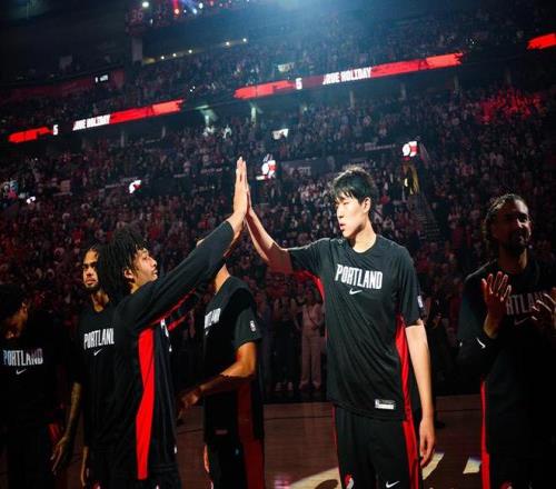 北京時(shí)間2025年10月23日,開(kāi)拓者隊(duì)球員楊瀚森(前右)與隊(duì)友夏普(前左)在賽前擊掌。當(dāng)日,在2025-2026賽季NBA常規(guī)賽中,波特蘭開(kāi)拓者隊(duì)主場(chǎng)114比118不敵明尼蘇達(dá)森林狼隊(duì)。開(kāi)拓者隊(duì)中國(guó)球員楊瀚森替補(bǔ)出戰(zhàn),迎來(lái)自己的NBA常規(guī)賽首秀。 新華社/美聯(lián)